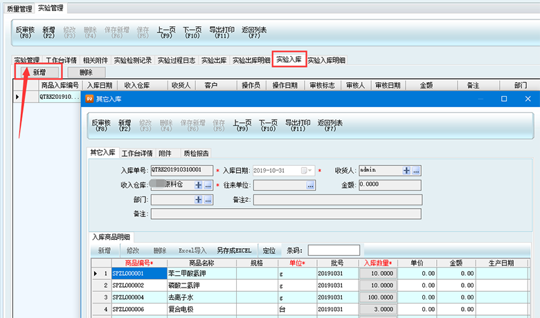 4、實驗入庫,可以用來登記買回來的實驗用品。點擊實驗入庫-點擊新增,選擇收入倉庫和需要入庫的商品。