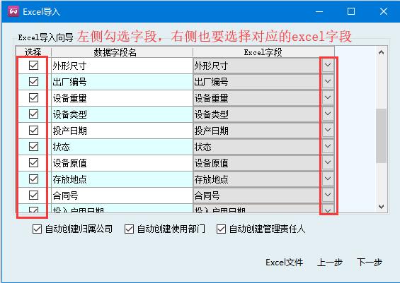 3、在彈出的窗口中,左側勾選要導入的字段,右側也要選擇對應的excel字段,選擇好以后,點擊下一步