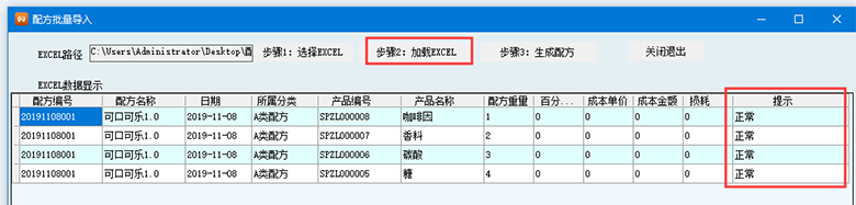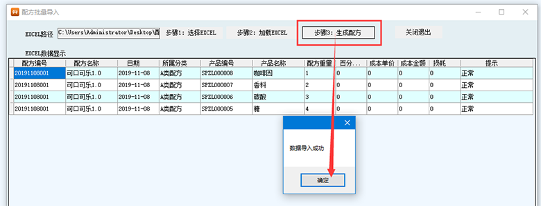 5、最后,點擊 步驟3:生成配方,則提示數據導入成功,點擊確定。