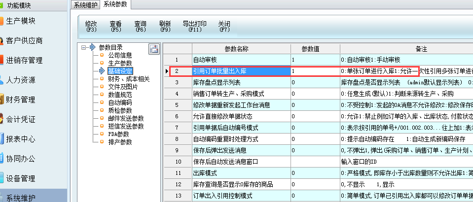1、在系統維護—系統參數—基礎設定—引用訂單批量出入庫,修改參數值為1,保存后重新登錄軟件