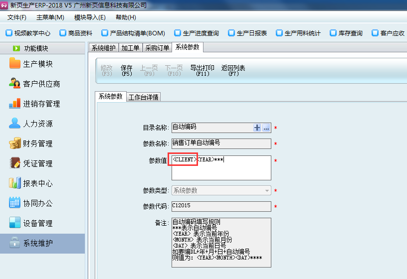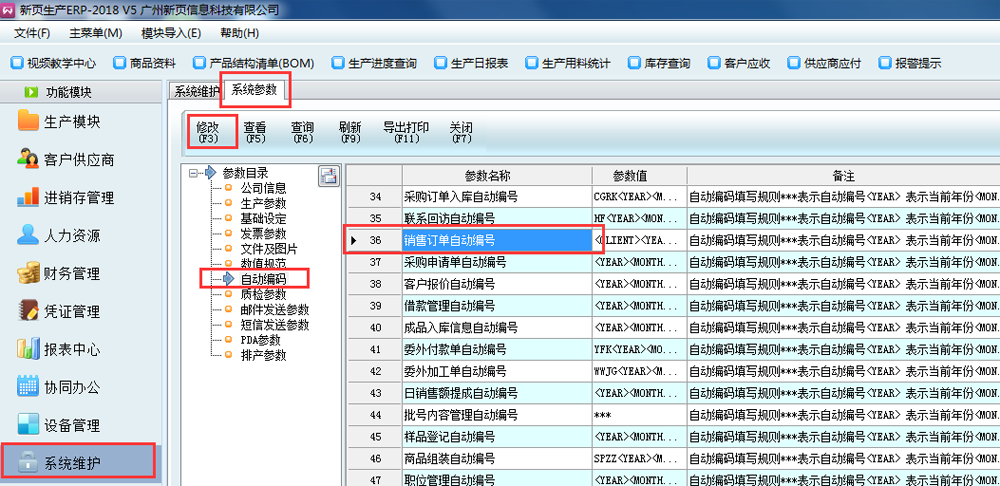 1、在系統維護-系統參數-自動編碼,選擇銷售訂單自動編碼,點擊菜單欄修改