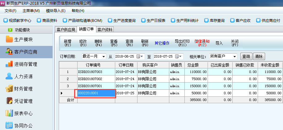 3、重新登錄系統后,下達銷售訂單后,可見銷售訂單編號變成00022018001, 0002 就是該客戶的客戶編號