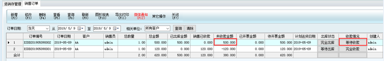 1、看下圖第一行,第一張單據,未收款金額是500,顯示等待收款,接下來,就去把這個訂單做收款