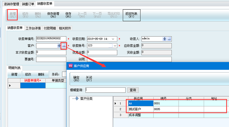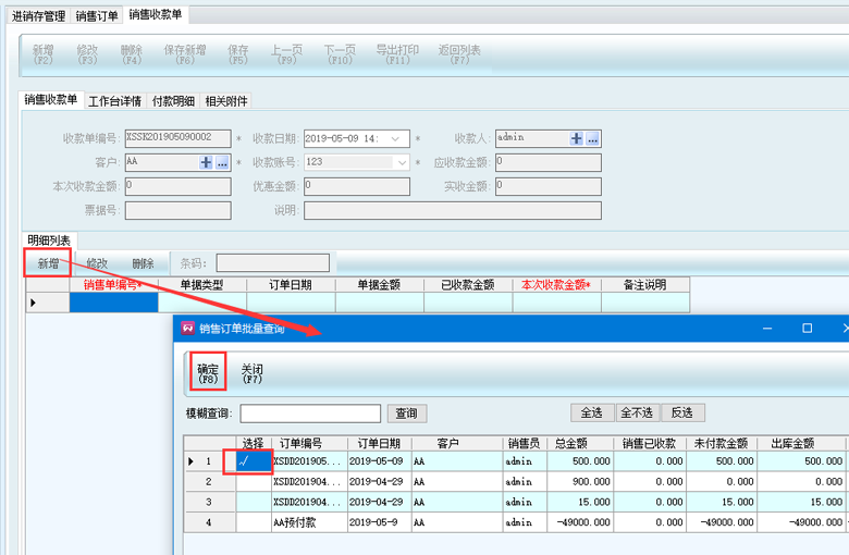 3、點擊從表新增按鈕,選擇要收款的訂單,然后點擊確定