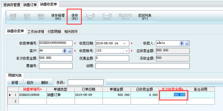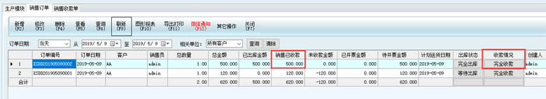 5、此時,回到銷售訂單列表界面,可以看到,這張訂單顯示已收款金額為500,收款情況是完全收款。