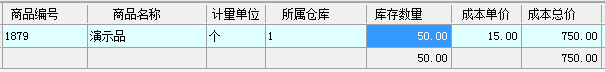 如:演示品 在倉庫1 庫存余50個 成本15元