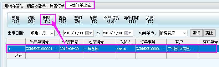 1、在銷售訂單出庫中,找到對應的單據,刪除