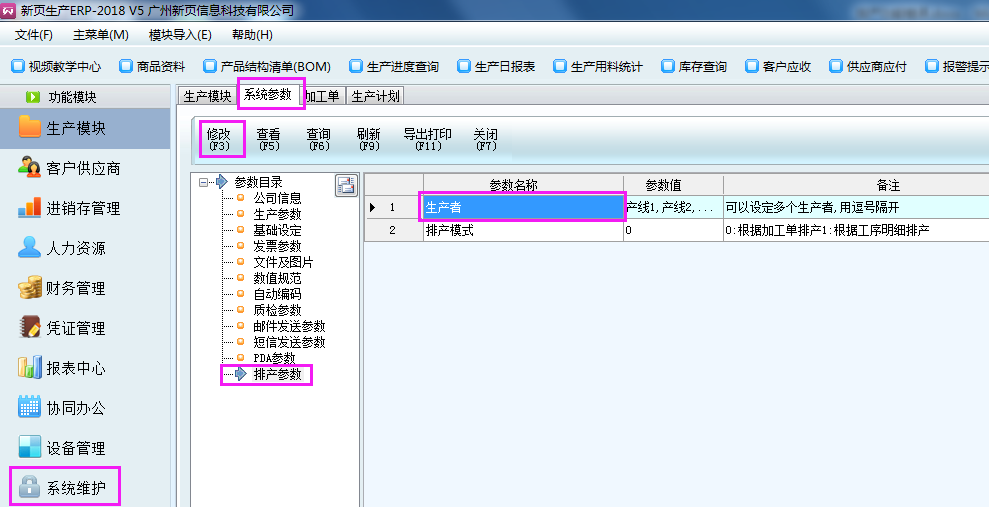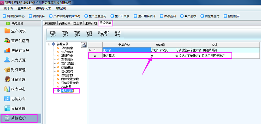 1、在系統(tǒng)維護(hù)-系統(tǒng)參數(shù)-排產(chǎn)參數(shù),把排產(chǎn)模式的參數(shù)改為0,意思即為根據(jù)加工單來(lái)排產(chǎn),退出系統(tǒng),重新登錄即生效。