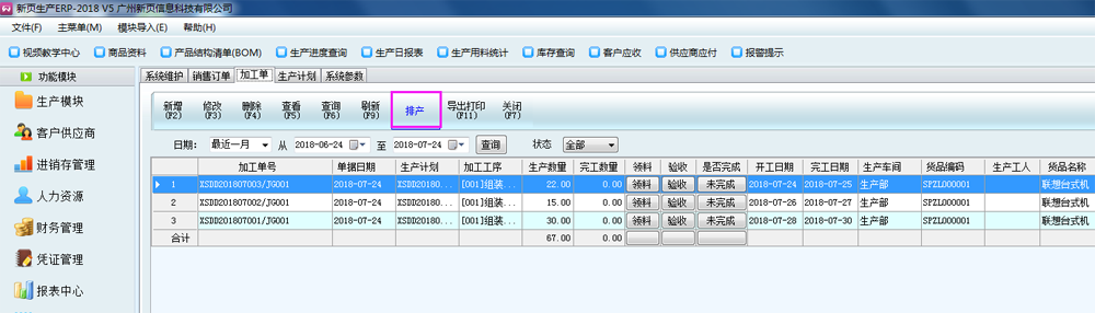 3、在生產(chǎn)模塊-加工單列表,如下圖,有3張加工單,點(diǎn)擊菜單欄“排產(chǎn)”