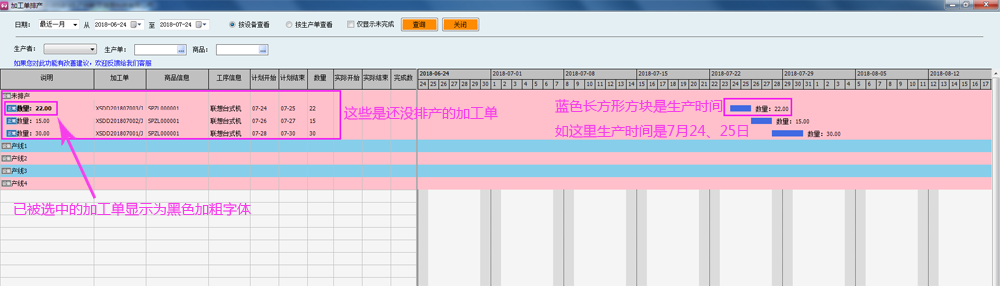 4、打開排產(chǎn)功能后,界面中左邊(紅框內(nèi))的加工單是還沒(méi)排產(chǎn)的加工單,已被選中的加工單顯示為黑色加粗字體(如下圖),右邊藍(lán)色的方塊是對(duì)應(yīng)加工單的生產(chǎn)時(shí)間,可手動(dòng)調(diào)整。