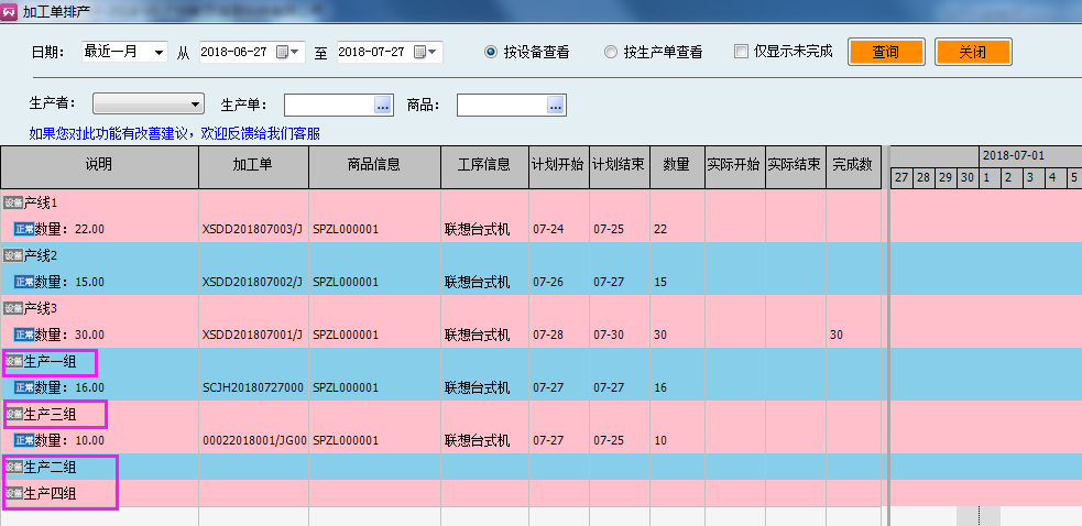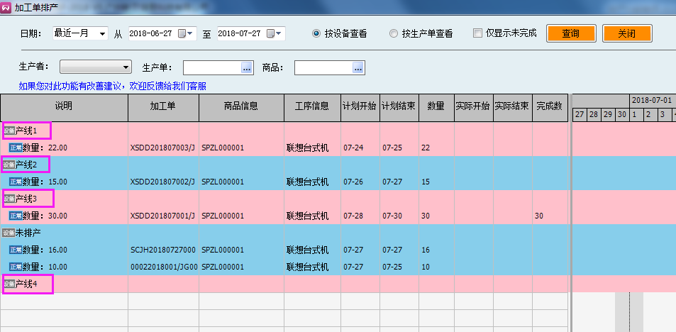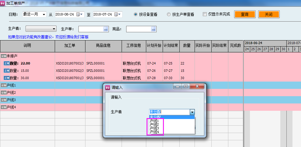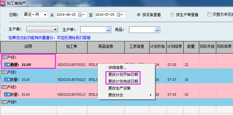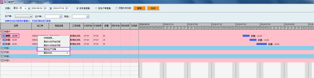 5、開始排產(chǎn),例如,這里選中第一張加工單(顯示為黑色加粗字體),點(diǎn)擊鼠標(biāo)右鍵,選擇更改生產(chǎn)設(shè)備,生產(chǎn)者選擇需要的產(chǎn)線,點(diǎn)擊確定,這樣就把加工單分配到產(chǎn)線上了,如需修改生產(chǎn)時(shí)間,則選中加工單,點(diǎn)擊鼠標(biāo)右鍵,選擇更改計(jì)劃開始日期或者更改計(jì)劃完成日期。