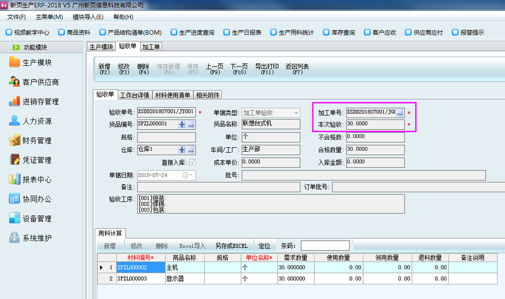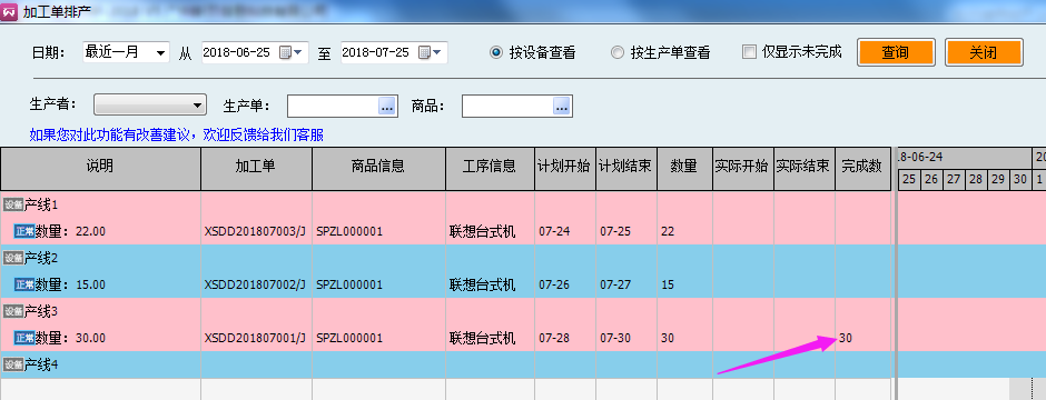 6、把加工單都分配到產(chǎn)線上后,當(dāng)生產(chǎn)單完成驗(yàn)收之后,會(huì)如下顯示,產(chǎn)線上的完成數(shù)量會(huì)顯示驗(yàn)收的數(shù)量。