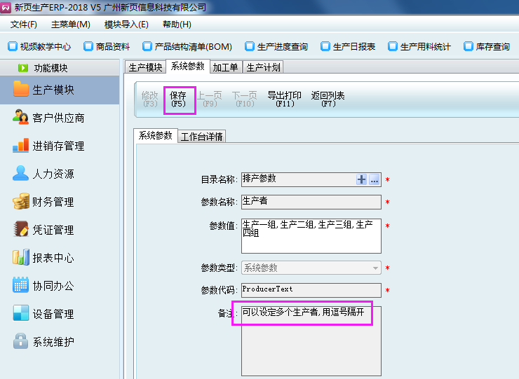 2、如下圖所示,生產(chǎn)線的名稱為產(chǎn)線1、產(chǎn)線2、產(chǎn)線3、產(chǎn)線4,這個(gè)名稱用戶可根據(jù)實(shí)際來(lái)修改,在系統(tǒng)維護(hù)-系統(tǒng)參數(shù)-排產(chǎn)參數(shù)-生產(chǎn)者來(lái)修改,例如這里把產(chǎn)線名稱改為生產(chǎn)一組、生產(chǎn)二組、生產(chǎn)三組、生產(chǎn)四組,點(diǎn)擊保存,退出軟件重新登錄,可見(jiàn)生產(chǎn)設(shè)備的名稱變成剛才修改的。